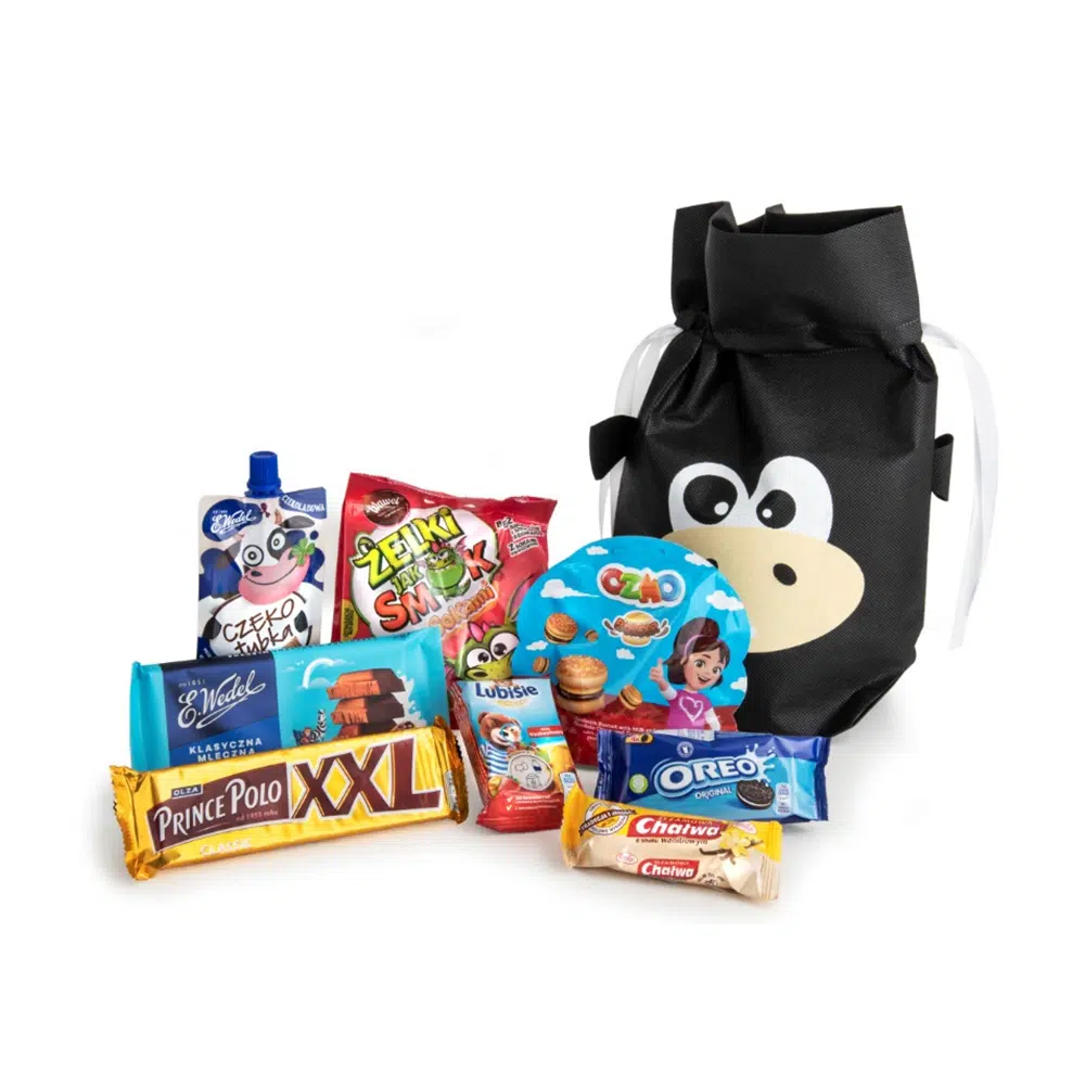 • Słodycze spakowane w ozdobny worek z tkaniny ściągany tasiemką.